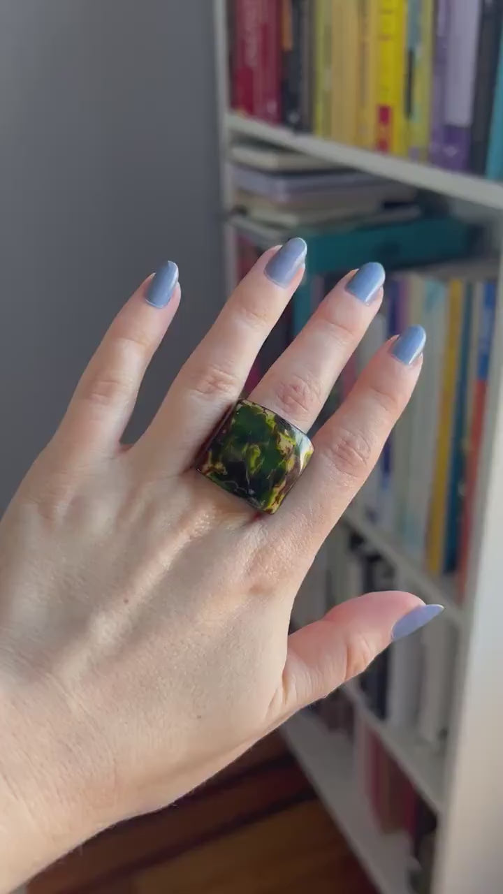 Discover the beauty of our Vibrant Green Tagua Ring, a fresh, raw, big statement piece hand-carved from eco-friendly tagua nuts. This military green, forest-hued ring exudes elegance with a shiny finish, perfect for any occasion. Lightweight, minimalist, and sustainable, it combines a green aesthetic with timeless style.